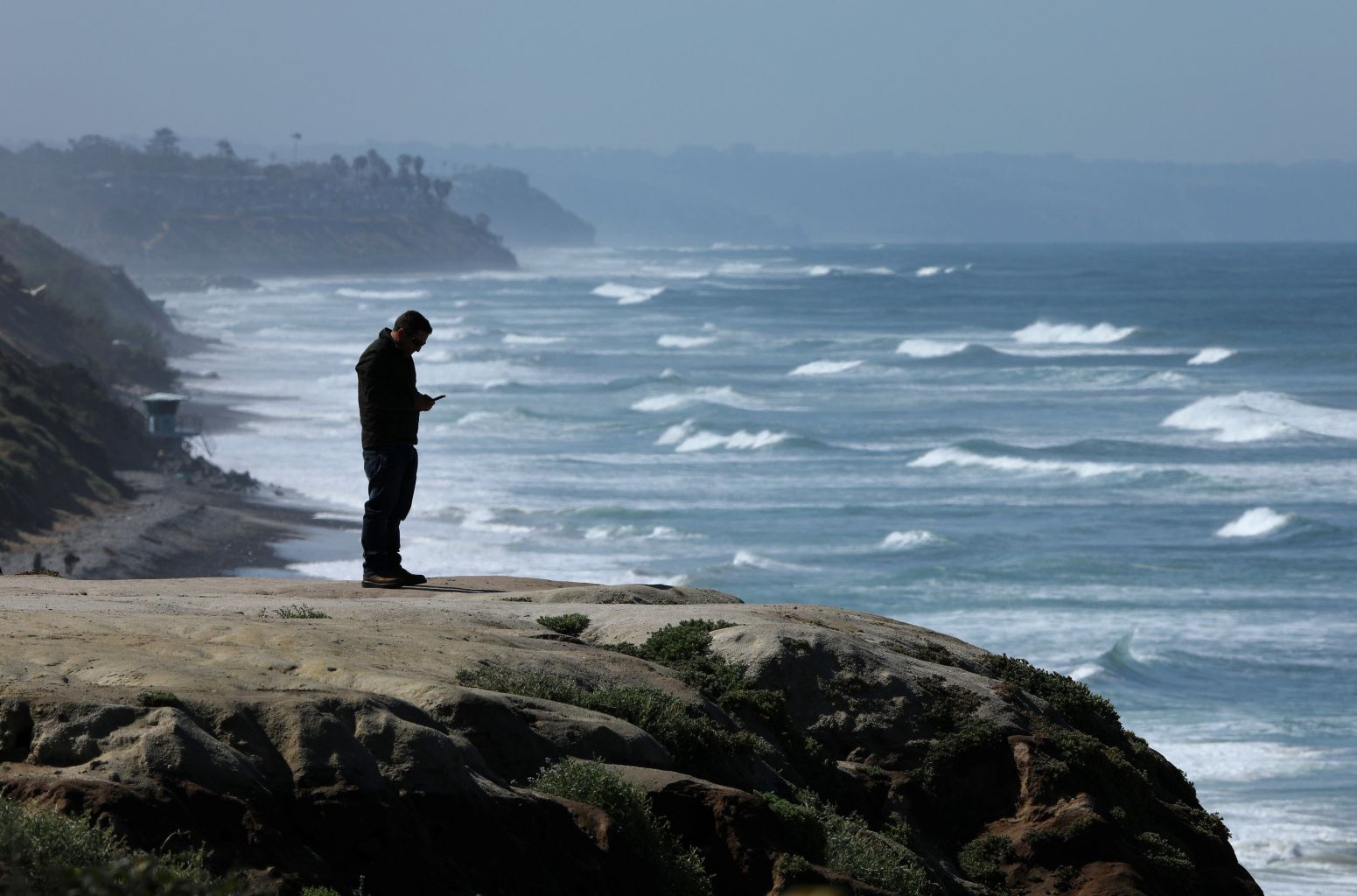 A man's phone keeps his attention as a storm brings large waves to the coastline in Carlsbad, California in May 2017.