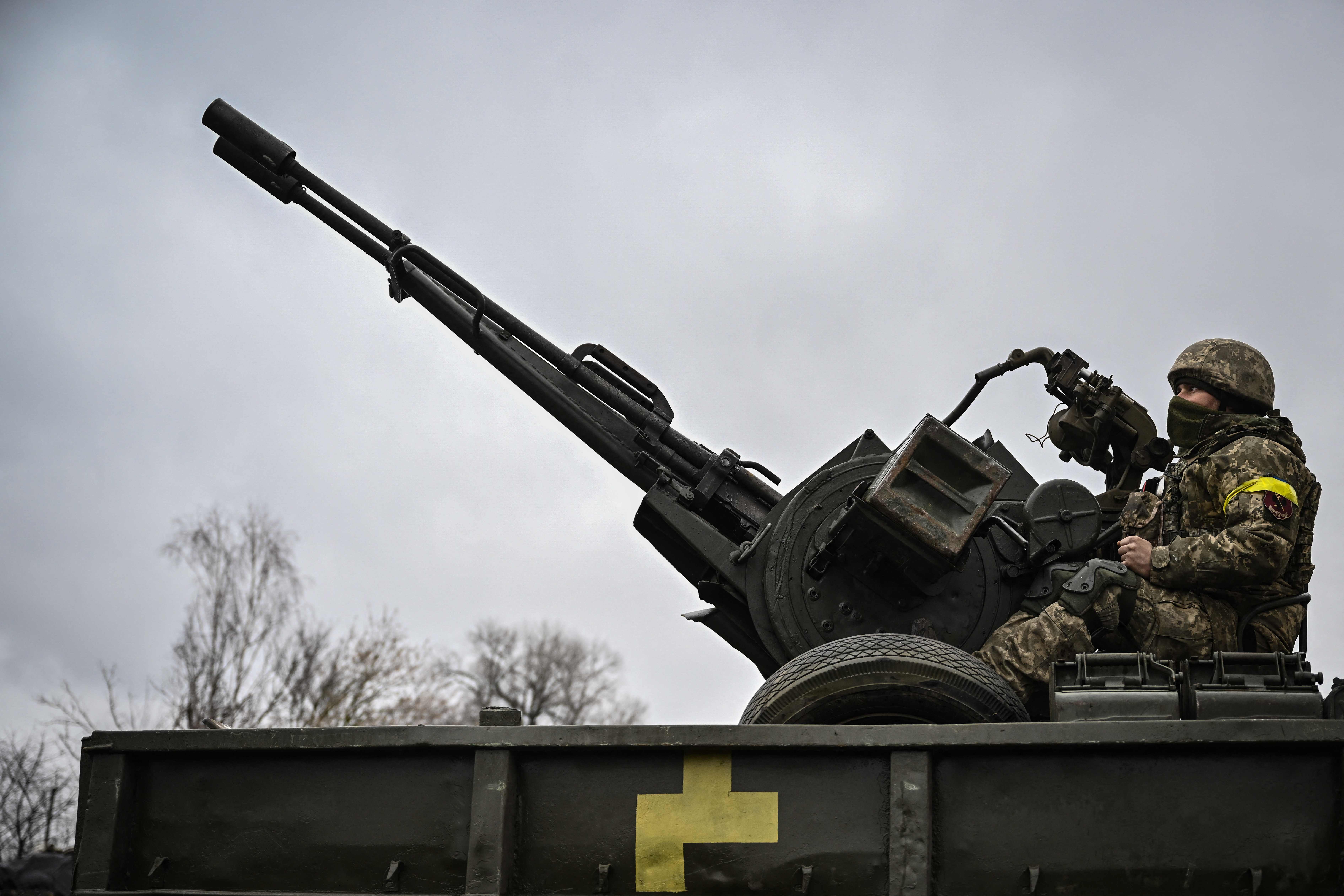 A Ukrainian soldier holds an anti-aircraft gun at a front-line position, north-east of Kyiv, on March 3, 2022.