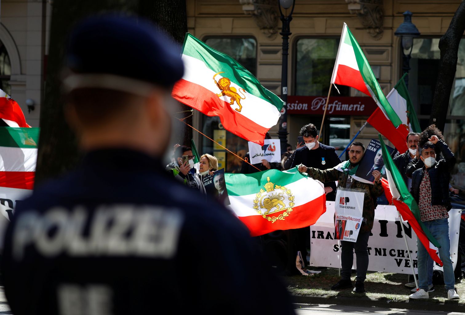 An Iranian opposition group protests outside the hotel where the talks are taking place in Vienna, Austria, April 9, 2021.