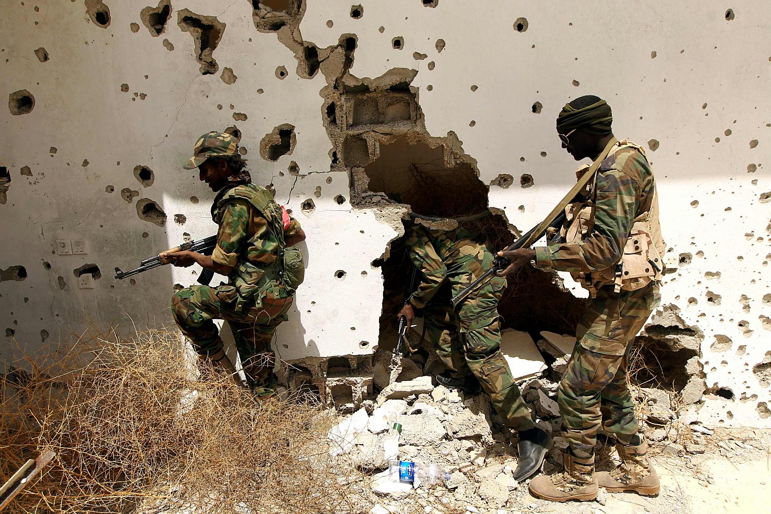 Libyan pro-government forces patrolling an area on the outskirts of Benghazi on April 19.