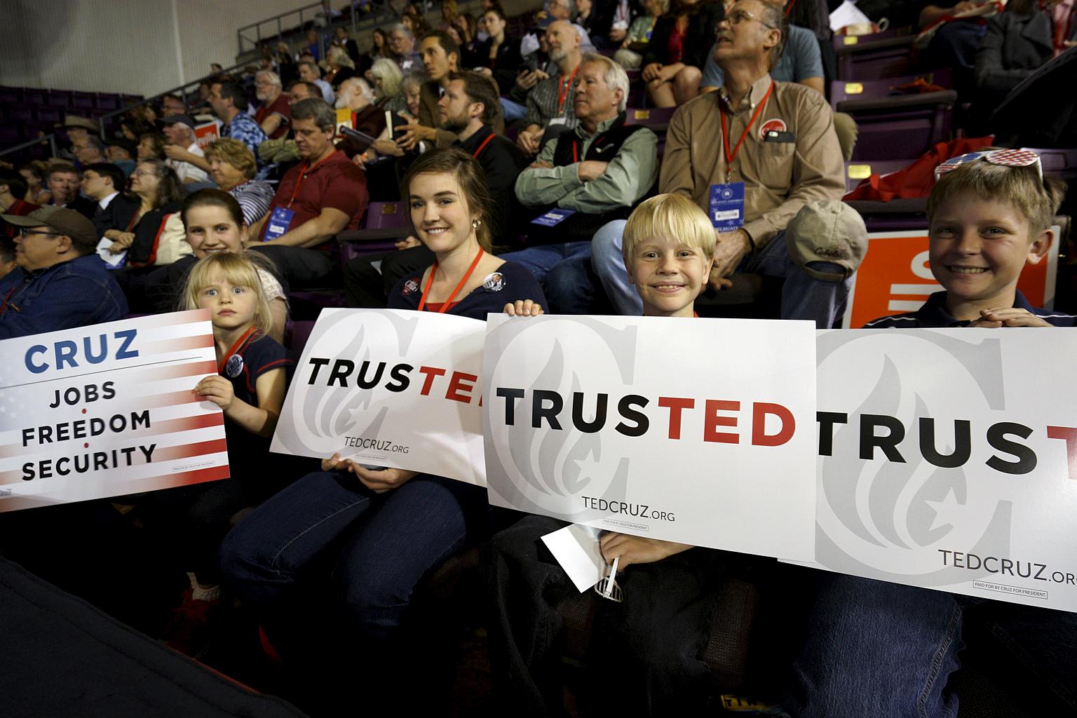 Supporters of US Republican presidential candidate Ted Cruz display signs in Colorado, on April 9, 2016.