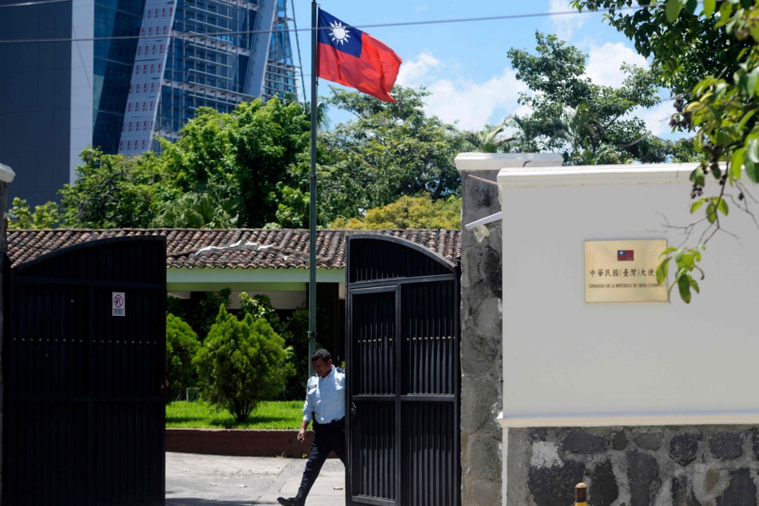 A guard closes the gate of the Embassy of Taiwan in San Salvador, on Aug 21, 2018.