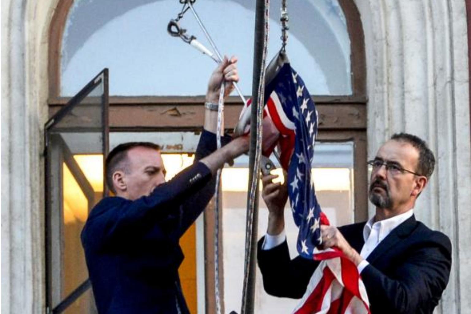 US consulate's employees removing the US national flag from the balcony of the US Consulate in Saint Petersburg on March 31, 2018.