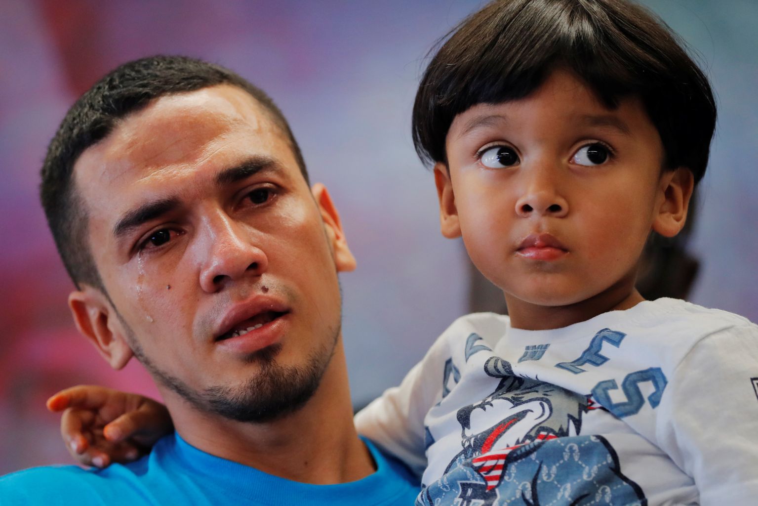 Javier, a 30 year old from Honduras, holds his four-year-old son, William, after they were separated for 55 days.