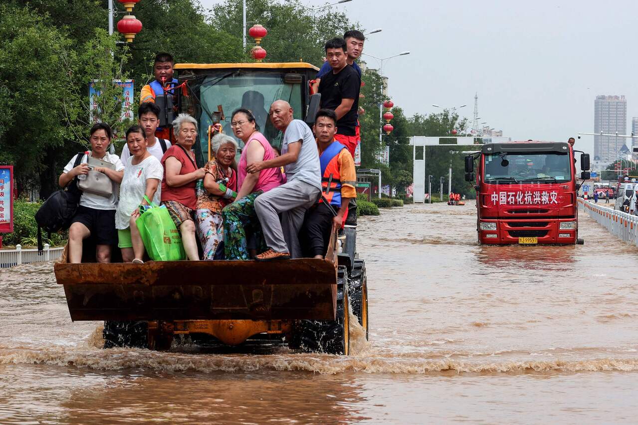 Rescuers evacuating residents with a loader in a flooded area in Weihui, Xinxiang city, in China's Henan province on July 26.