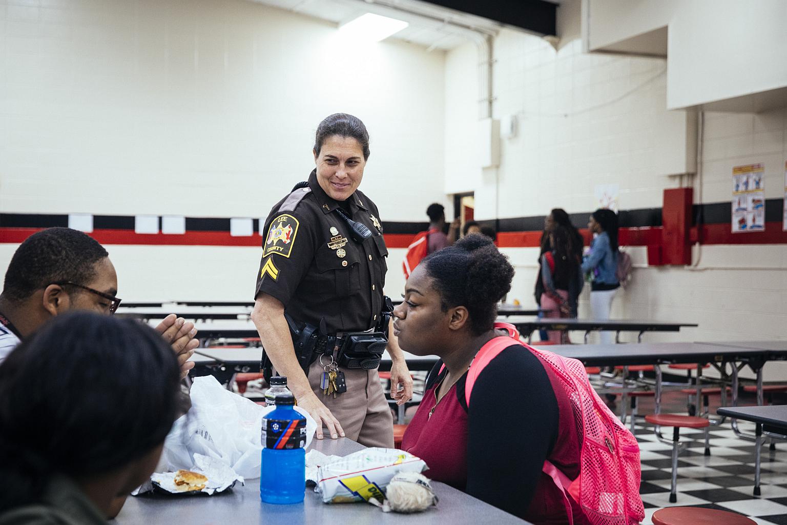 A school resource officer greeting elementary school students in Loachapoka, Ala, on March 1, 2018.