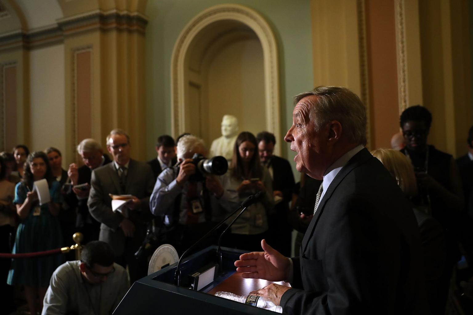 US Senator Richard Durbin speaks to reporters during a news conference on Capitol Hill following a procedural vote on the GOP healthcare Bill.