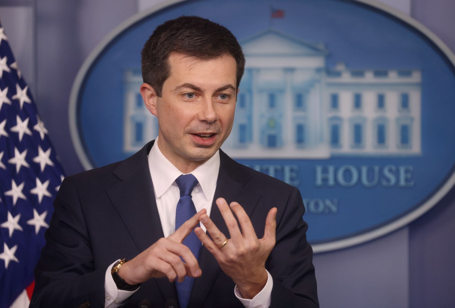 US Secretary of Transportation Pete Buttigieg speaks during a press briefing at the White House.