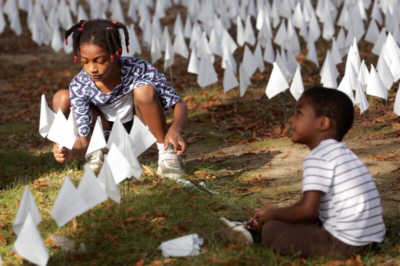 Hope Larkin plants flags with her brother during a press preview of the In America How Could This Happen art project in Washington, DC, on Oct 23, 2020.