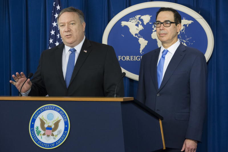 US Secretary of State Mike Pompeo (left) and US Treasury Secretary Steven Mnuchin hold a news conference during which they announced sanctions against Iran, at the Foreign Press Center in Washington, DC, US, on Nov 5, 2018.