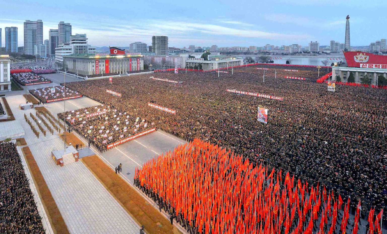 A mass rally taking place at Kim Il Sung Square in Pyongyang.