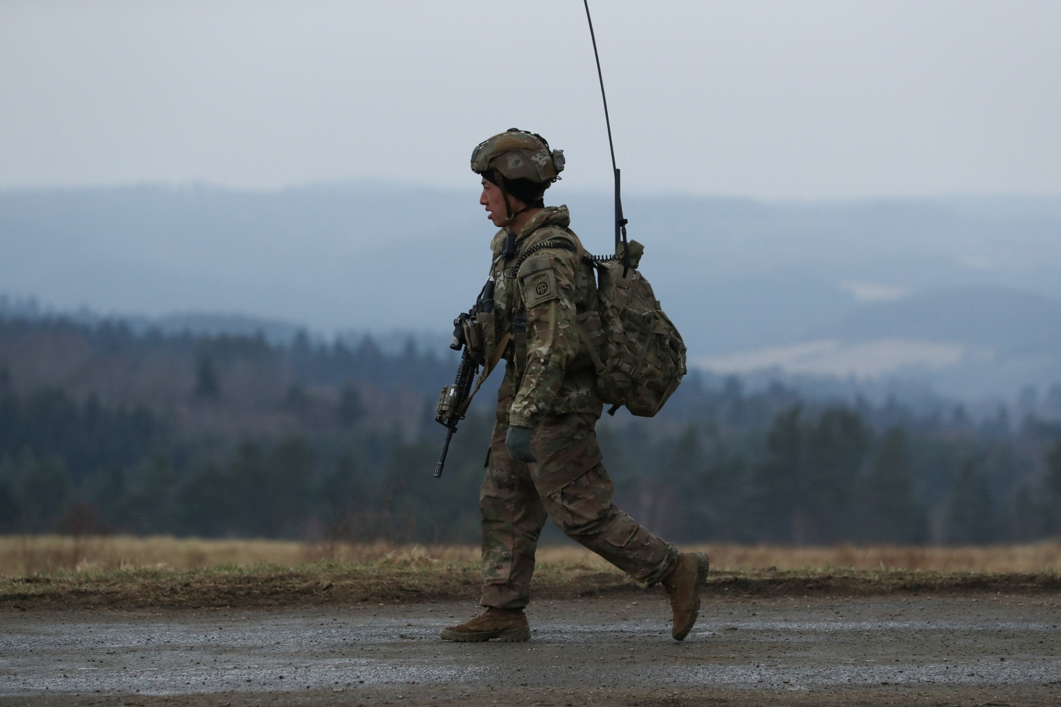 A US army soldier walks towards an airbase near Arlamow, Poland, amid the Ukraine war, on April 5, 2022.