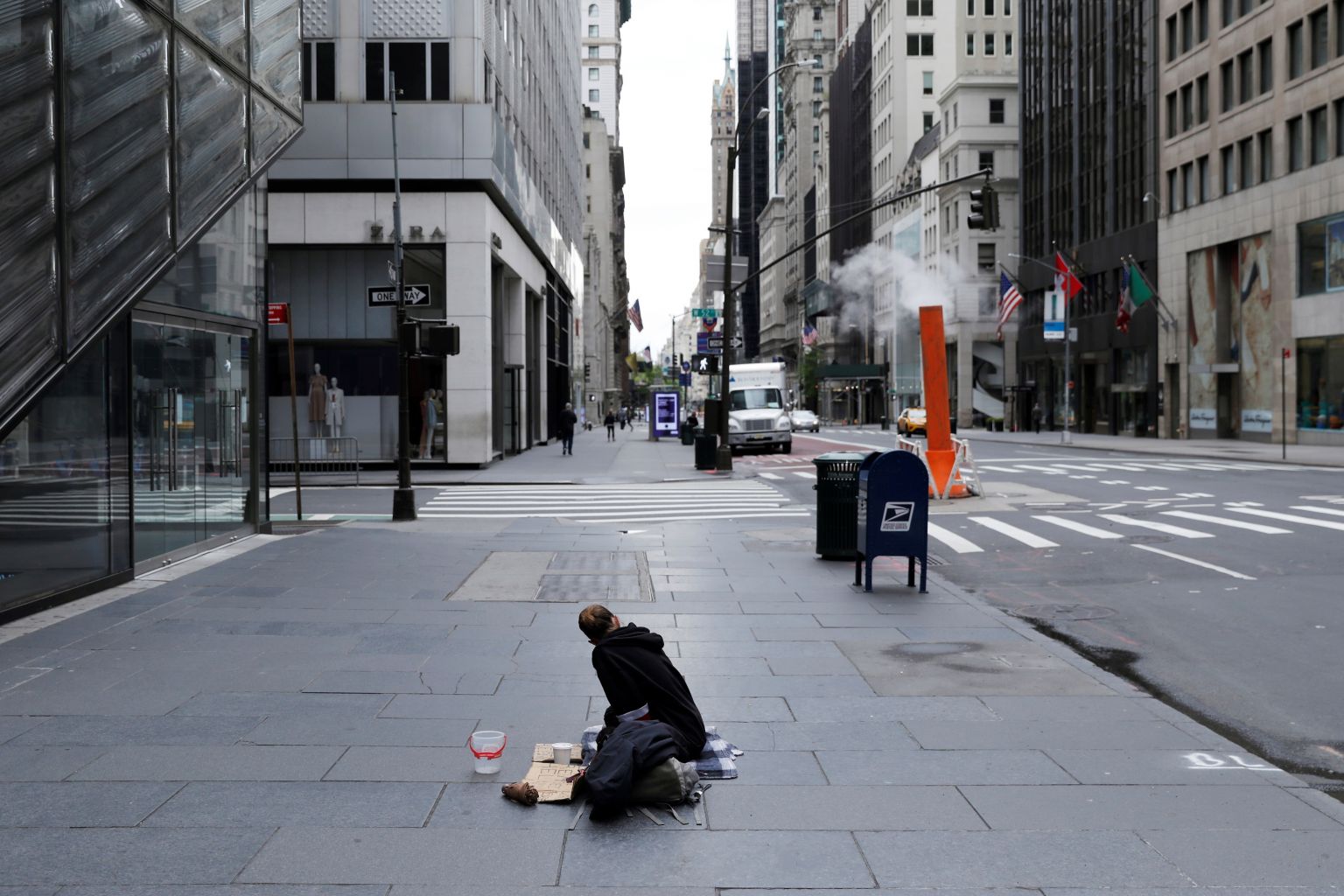A May 2020 photo shows a homeless woman begging for money in coronavirus-hit New York City.