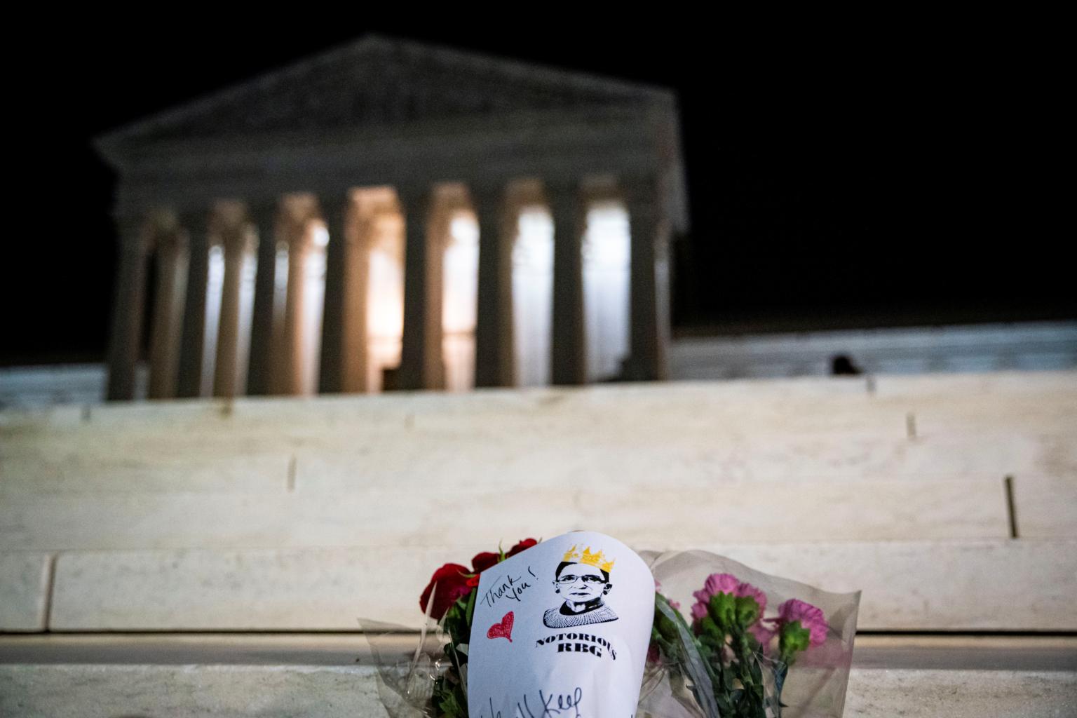 A bouquet of flowers in front of the US Supreme Court following the death of US Supreme Court Justice Ruth Bader Ginsburg on Sept 18, 2020.