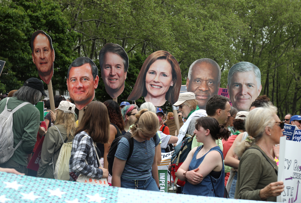 Publication of a leaked draft opinion that would overturn abortion rights has led to nationwide protests, including some at the homes of Chief Justice John Roberts and Justices Samuel Alito and Brett Kavanaugh in the suburbs of Washington.