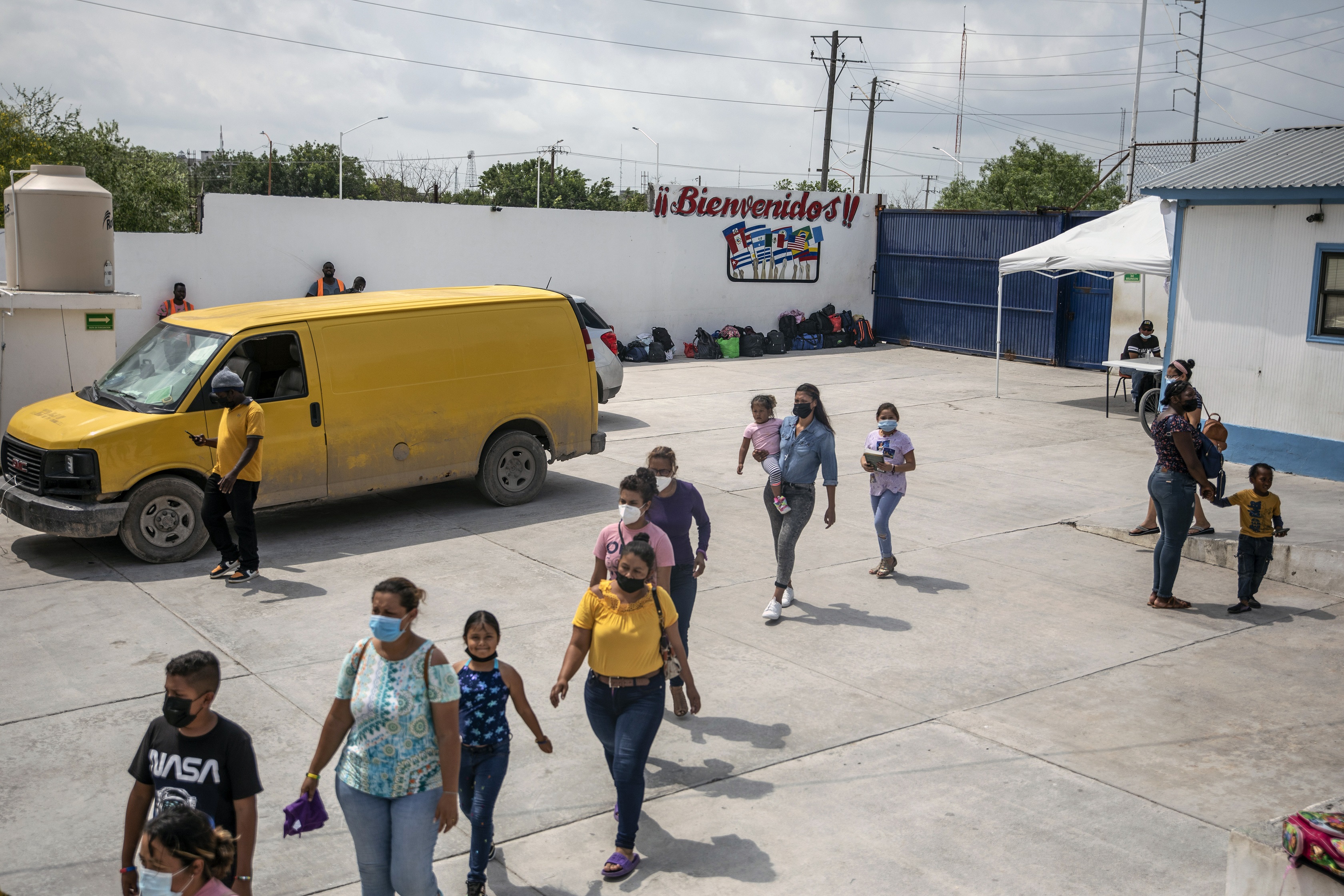 Families preparing to seek asylum in the US board a bus at a shelter for migrants in Mexico.