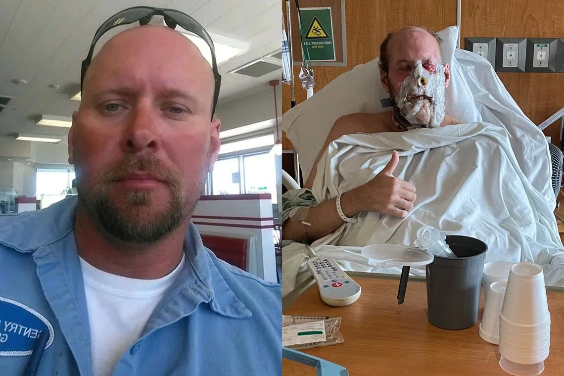 Mr Aaron James before and after suffering a 7,200-volt electric shock in June 2021, when his face touched a live wire.