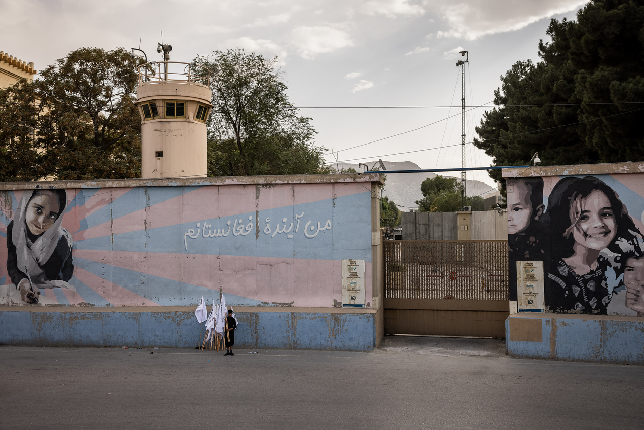 Taliban flags are sold outside the shuttered and abandoned US embassy in Kabul on Aug 22, 2021.