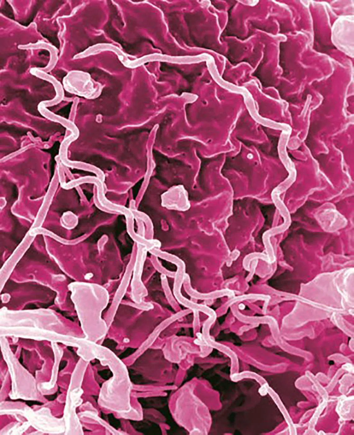 A micrograph showing numerous darkly stained Treponema pallidum, the bacterium that causes syphilis.