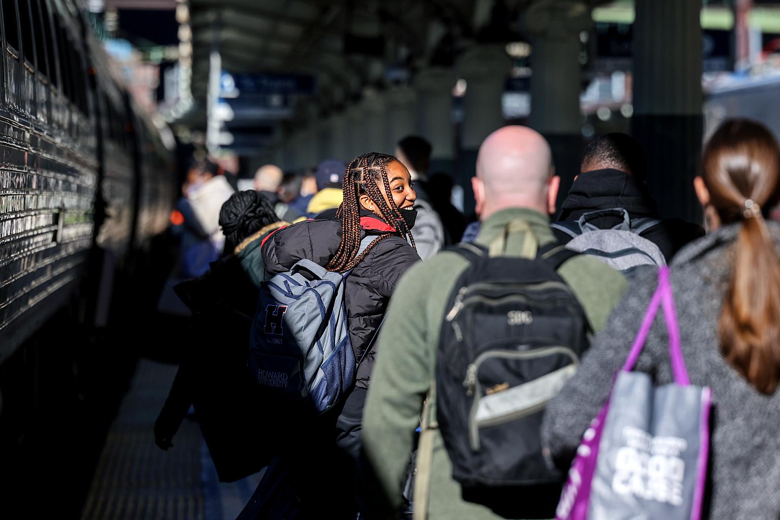 Travelers boarding a train ahead of the Thanksgiving holiday at Union Station in Washington, DC, on Nov 24, 2021.