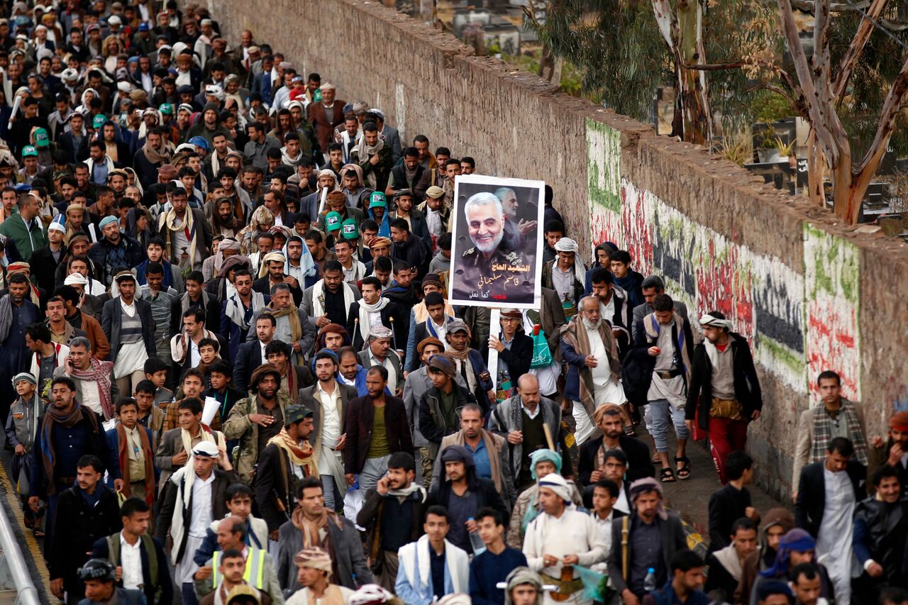 Yemeni supporters of the Houthi movement denounce the US killing of Iranian major general Qassem Soleimani and Iraqi paramilitary chief Abu Mahdi al-Muhandis in Sanaa, Yemen, on Jan 6, 2021.