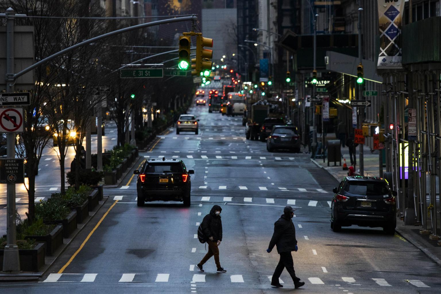 People cross Park Avenue in New York City on March 27, 2020.