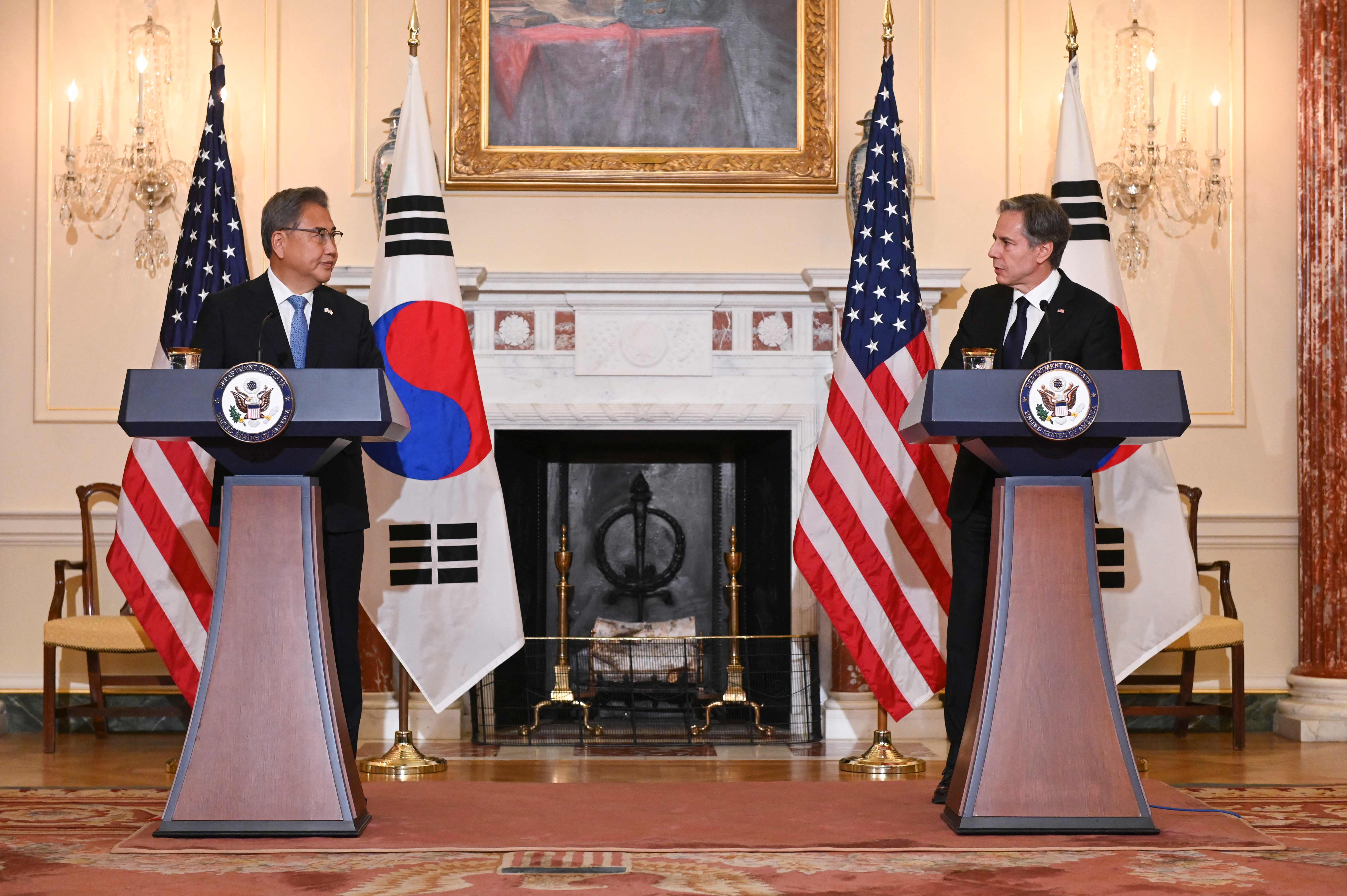 US Secretary of State Antony Blinken speaks with South Korean Foreign Minister Park Jin in Washington, DC on June 13, 2022.