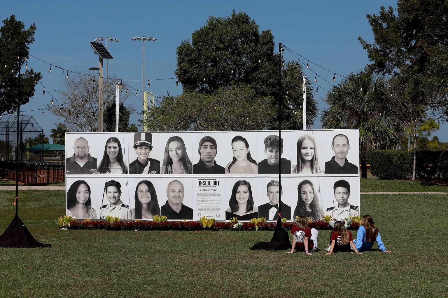 People sit in front of a photo display of the 17 people killed over the 2018 Parkland school shooting on Feb 14, 2022.
