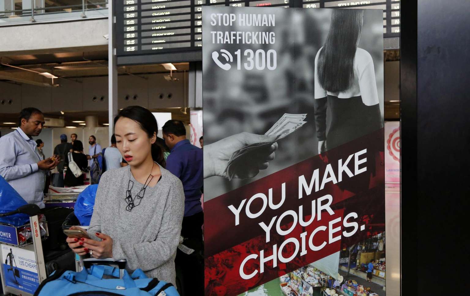 Tourists walking next to a Thai government campaign poster to stop human trafficking in the arrivals hall of the Suvarnabhumi International Airport in Bangkok.