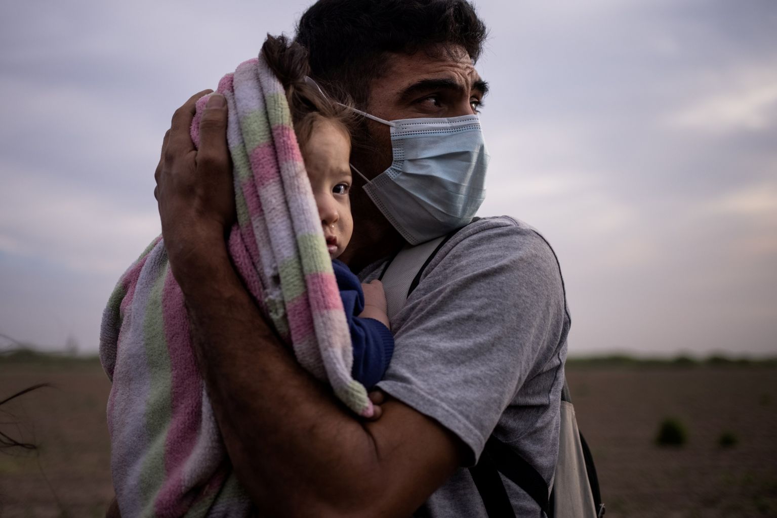An asylum seeking migrant from Honduras cradles his child after crossing the Rio Grande river from Mexico into the US on a raft.
