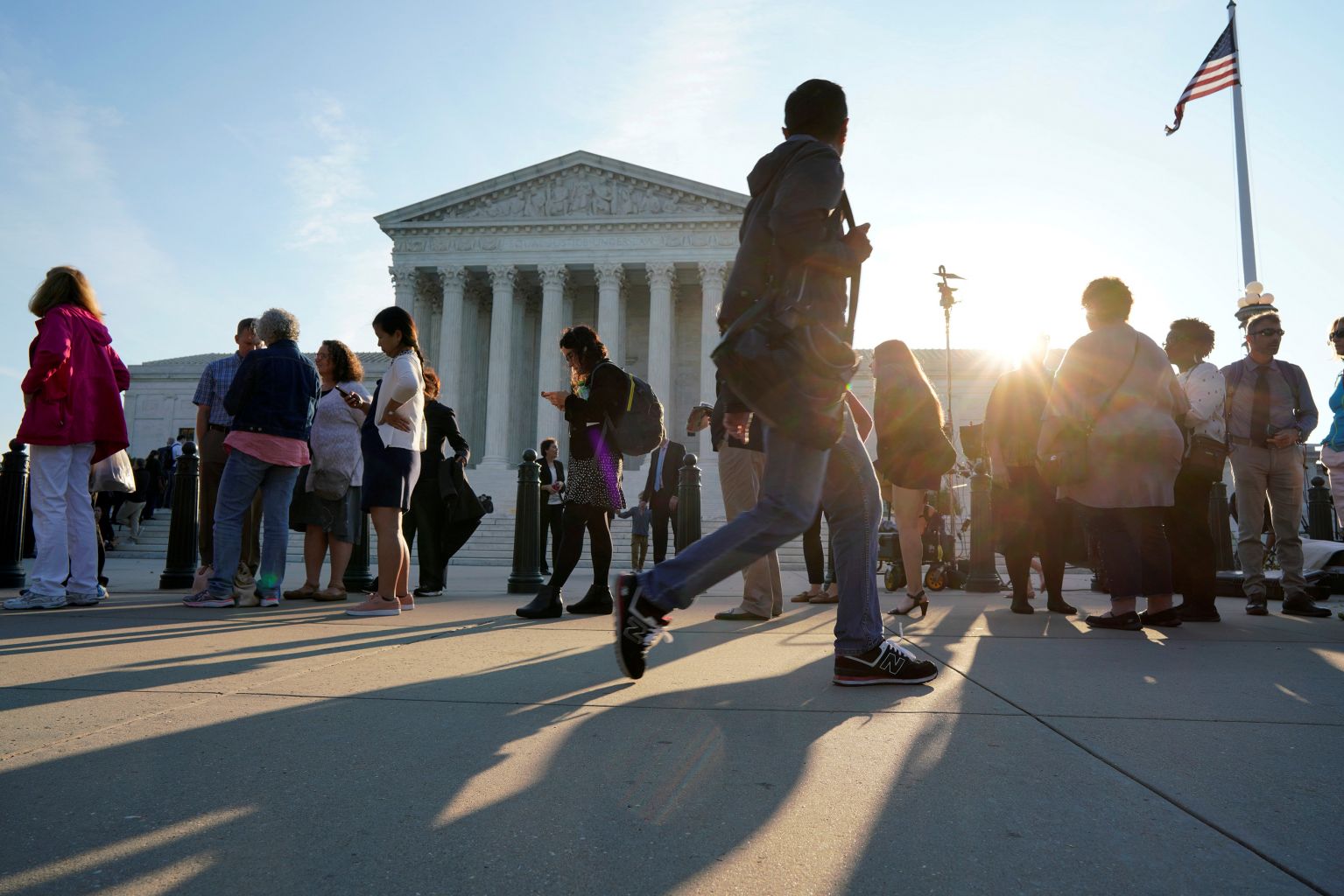 People wait in line to attend the opening day of the new term of the Supreme Court in Washington.