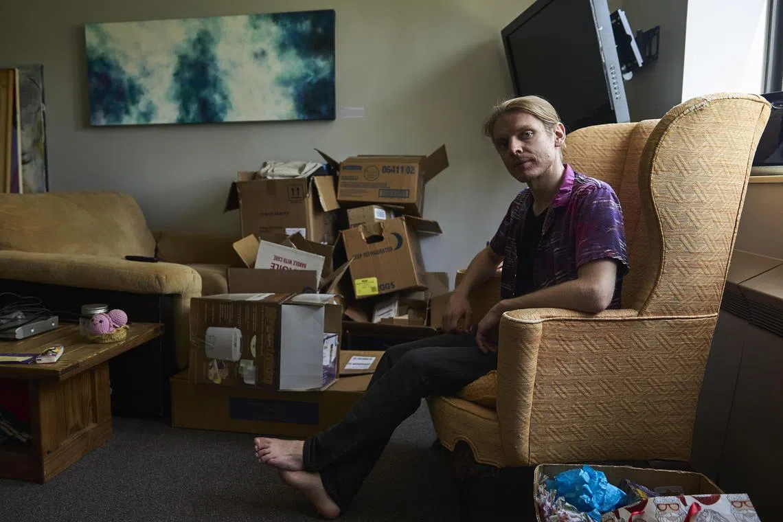 Mr Shua Wilmot packs up in his apartment to move out after he was let go for refusing to remove his pronouns from his work e-mail signature at Houghton University.