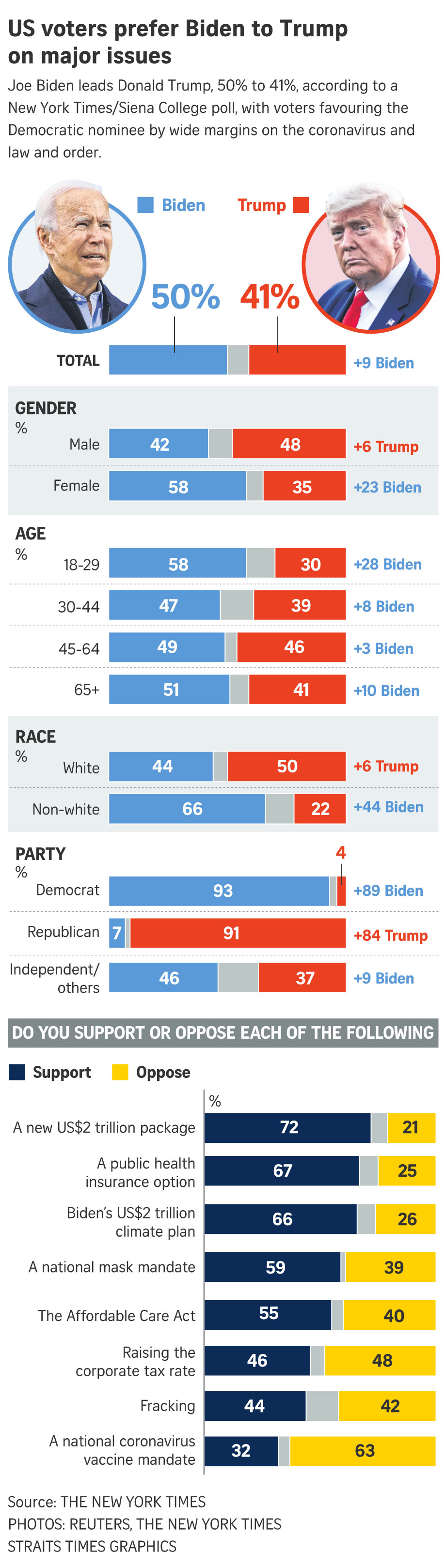 WASHINGTON (NYTIMES) - Joe Biden holds a nine-point lead over President Donald Trump amid widespread public alarm about the trajectory of the coronavirus pandemic and demand among voters for large-scale government action to right the economy, according to a national poll of likely voters conducted by The New York Times and Siena College.