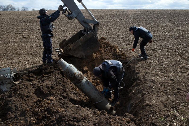 Emergency workers remove part of a Russian Smerch rocket from a field in Kharkiv, Ukraine, on April 6, 2022.
