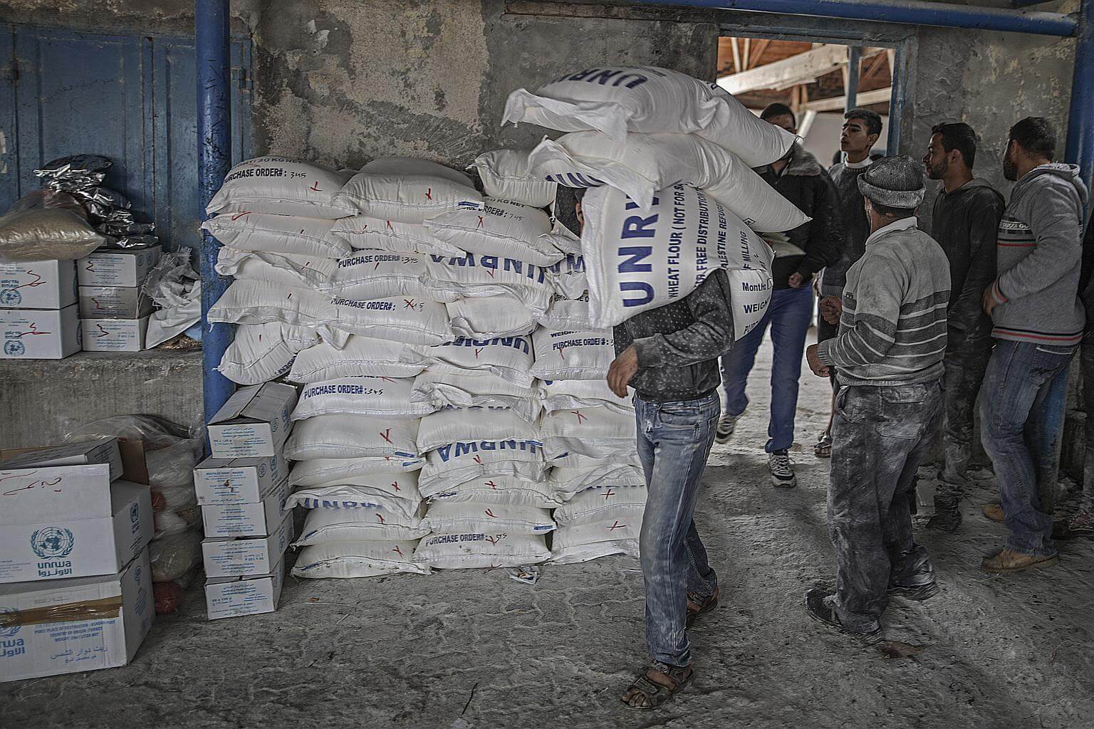 A Palestinian refugee man carries a sack of flour at the United Nation food distribution center in Al Shateaa refugee camp, in Gaza city, on Jan 15, 2018.