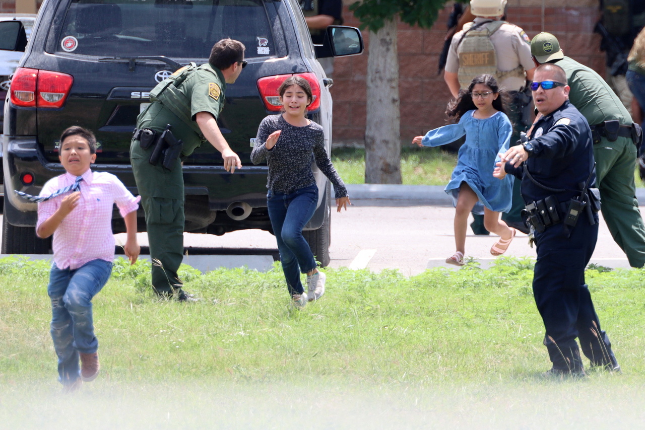 <p>Children run to safety after escaping from a window during a mass shooting at Robb Elementary School where a gunman killed nineteen children and two adults in Uvalde, Texas, U.S. May 24, 2022. Picture taken May 24, 2022. Pete Luna/Uvalde Leader-News/Handout via REUTERS