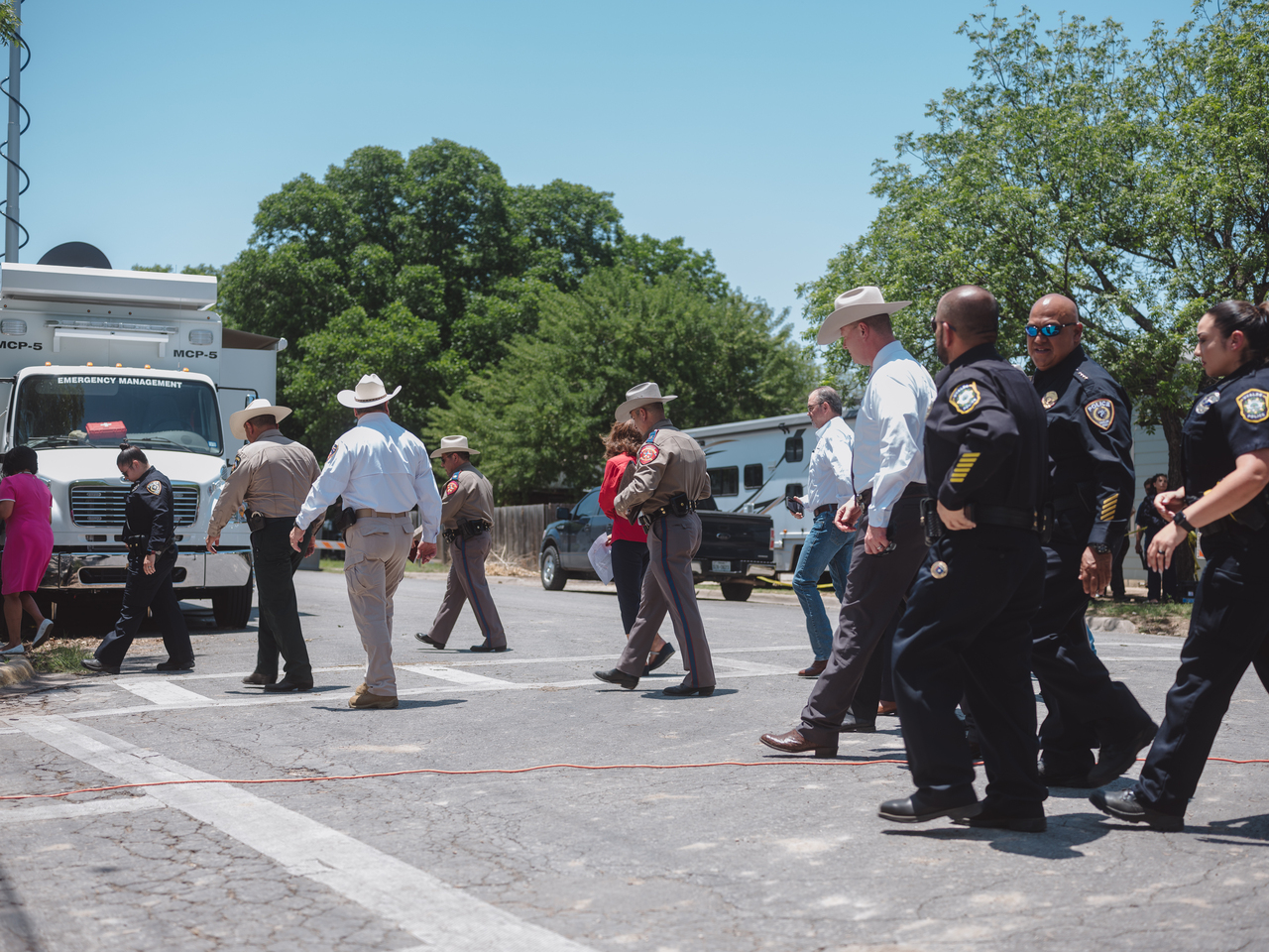Members of various law enforcement agencies at a news conference addressing the police response timeline on May 26, 2022.