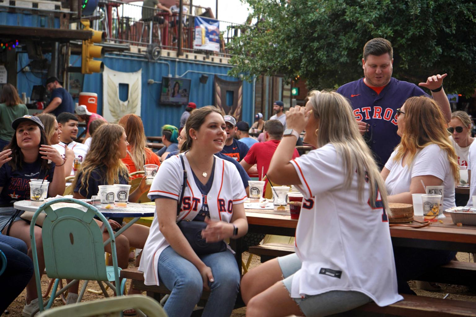 People gathering at Truck Yard beer garden in Houston, Texas, on April 9, 2021.
