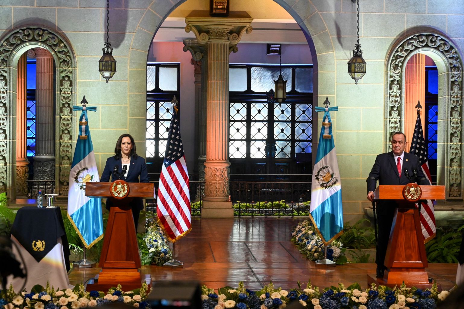 US Vice-President Kamala Harris (left) and Guatemalan President Alejandro Giammattei deliver a joint press conference at the Culture Palace in Guatemala City, on June 7, 2021.