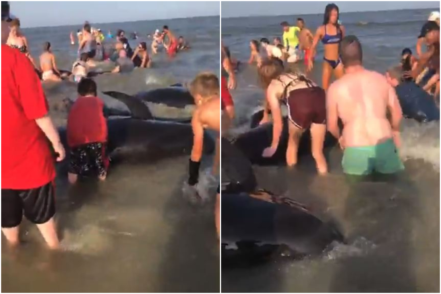 Onlookers captured the impromptu rescue on videos that have since drawn hundreds of thousands of views online. The footage showed several glossy black pilot whales flailing in knee-high water surrounded by small groups of people trying to push them away from the shallows.