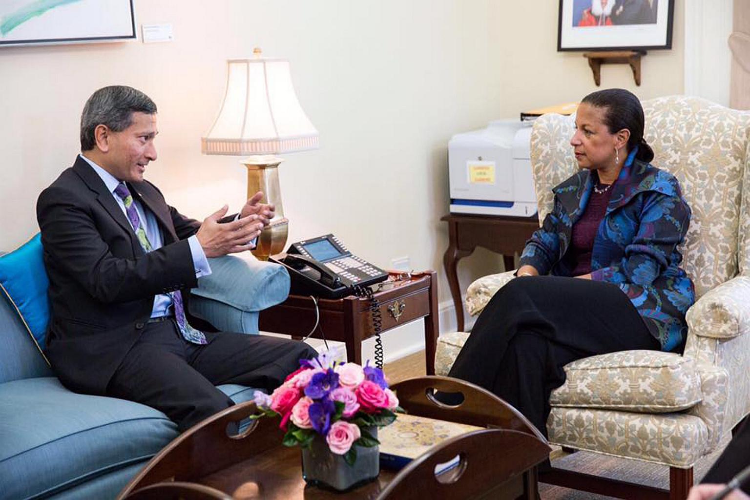 Minister for Foreign Affairs Vivian Balakrishnan (left) meeting US National Security Advisor Susan Rice.