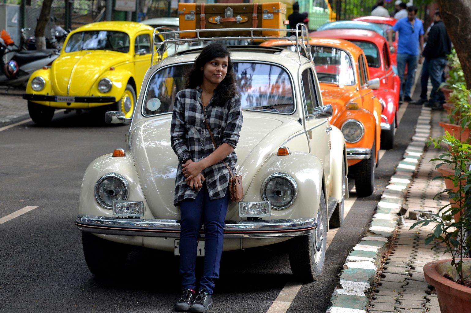 A girl stands in front of a vintage Volkswagen Beetle car during a Beetle rally in Bangalore, India, in June 2018.