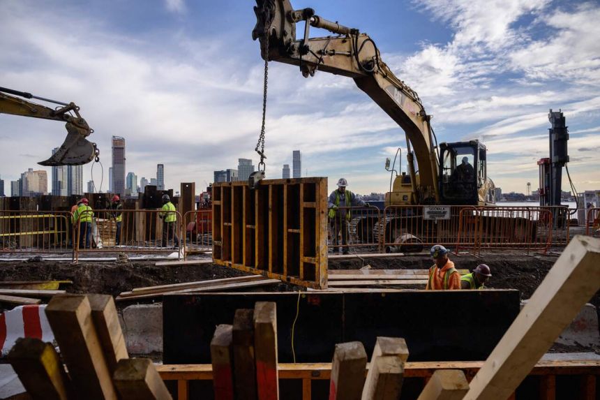 Construction workers at the site of a flood defense project on the east side of Manhattan, New York city on Dec 11, 2021.