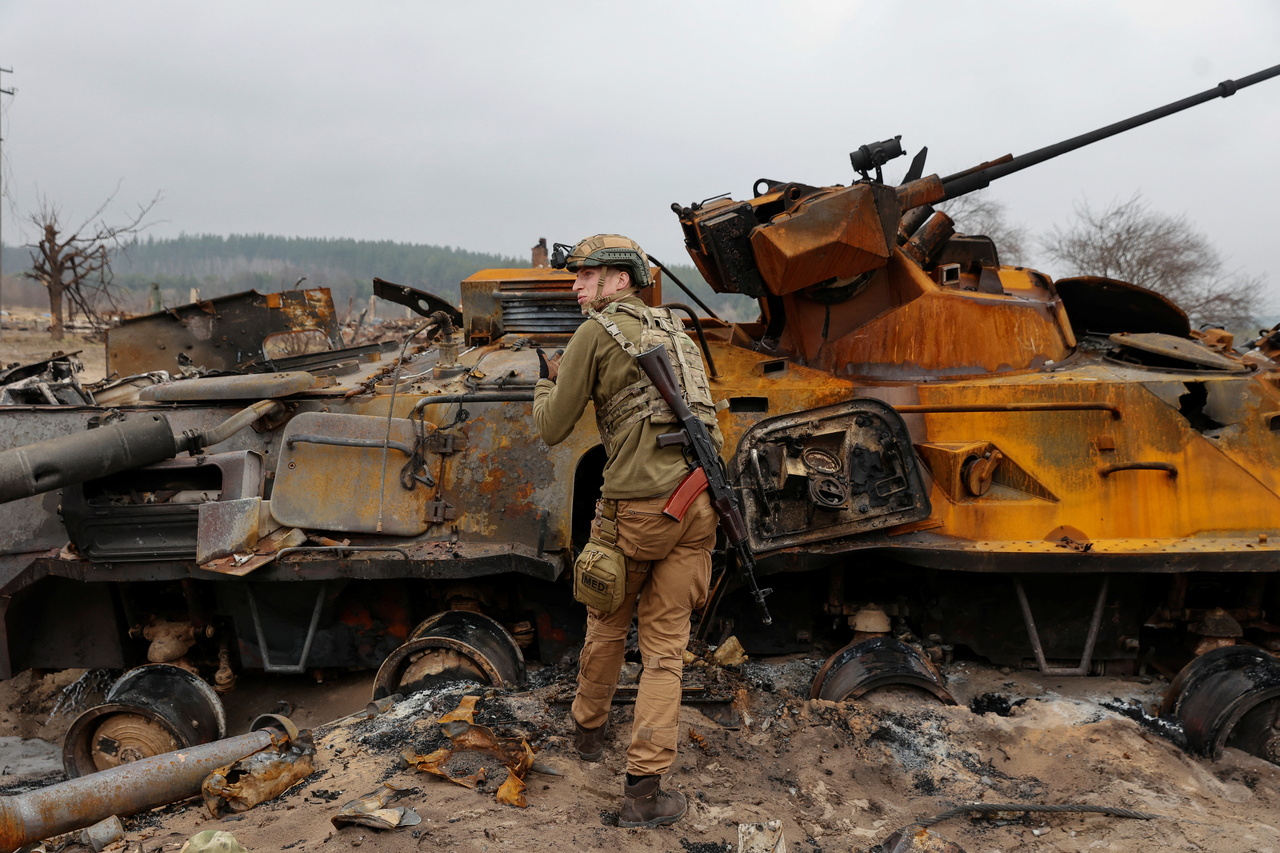 A Ukrainian soldier inspects destroyed Russian BTR-82 in a village near a frontline in Kyiv Region, on March 31, 2022.
