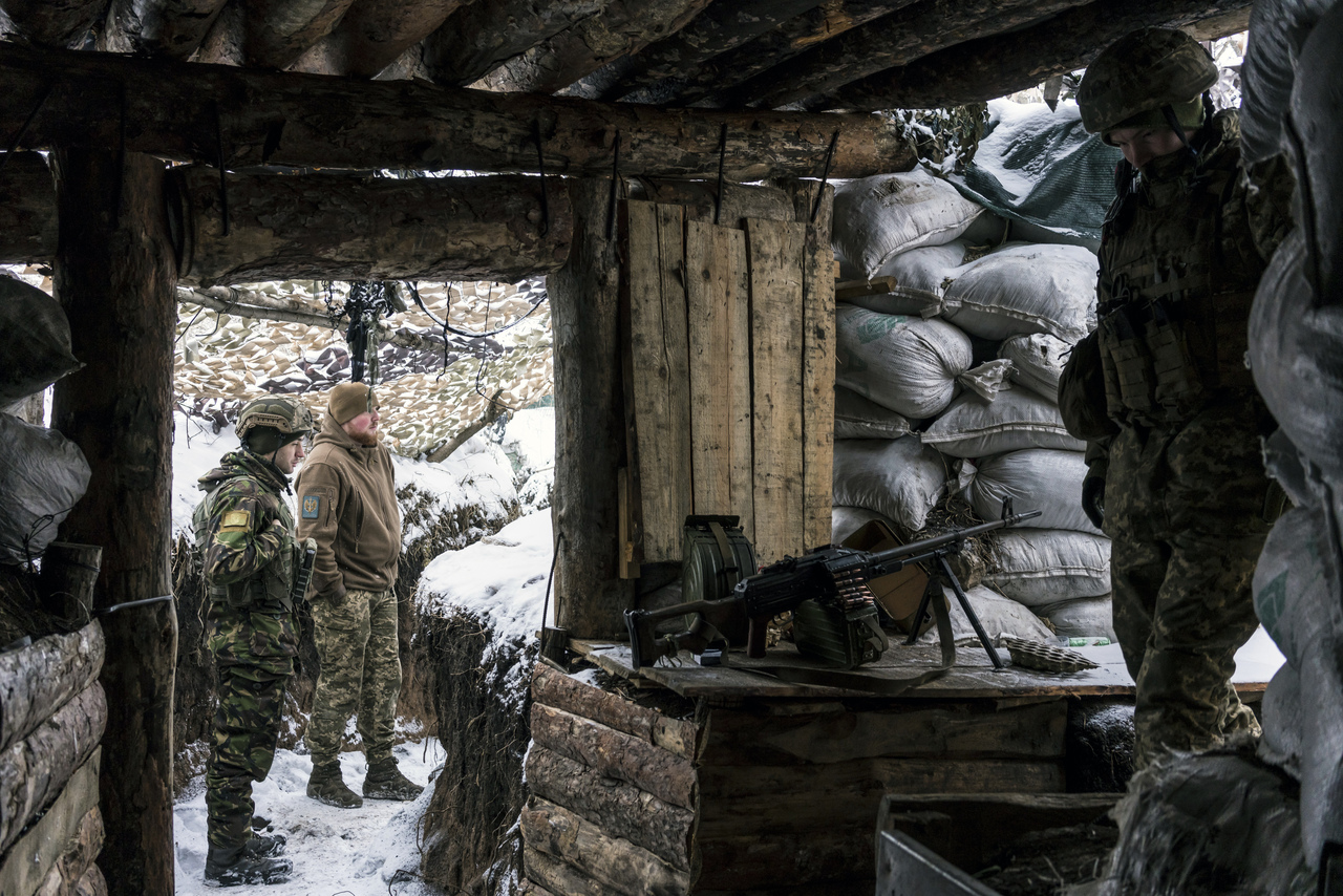 Ukrainian soldiers in a trench on the front line in Popasna on Jan 24, 2022.
