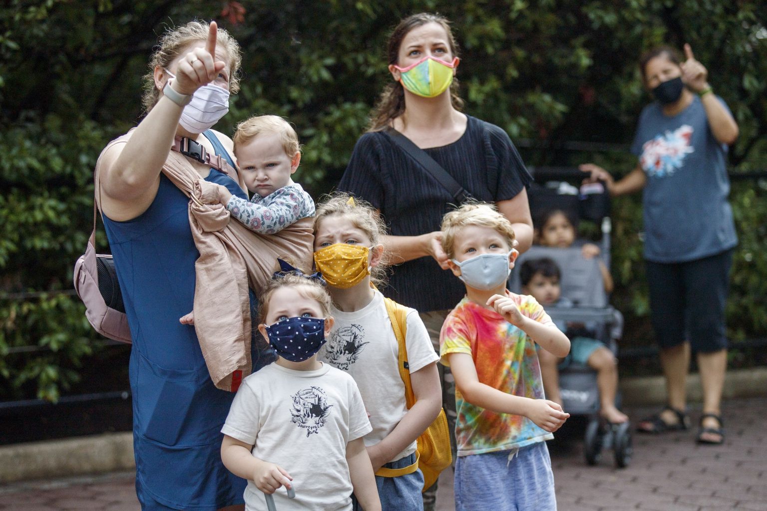 Visitors to the Smithsonian's National Zoo in Washington, DC watch orangutans cross overhead on July 24, 2020.