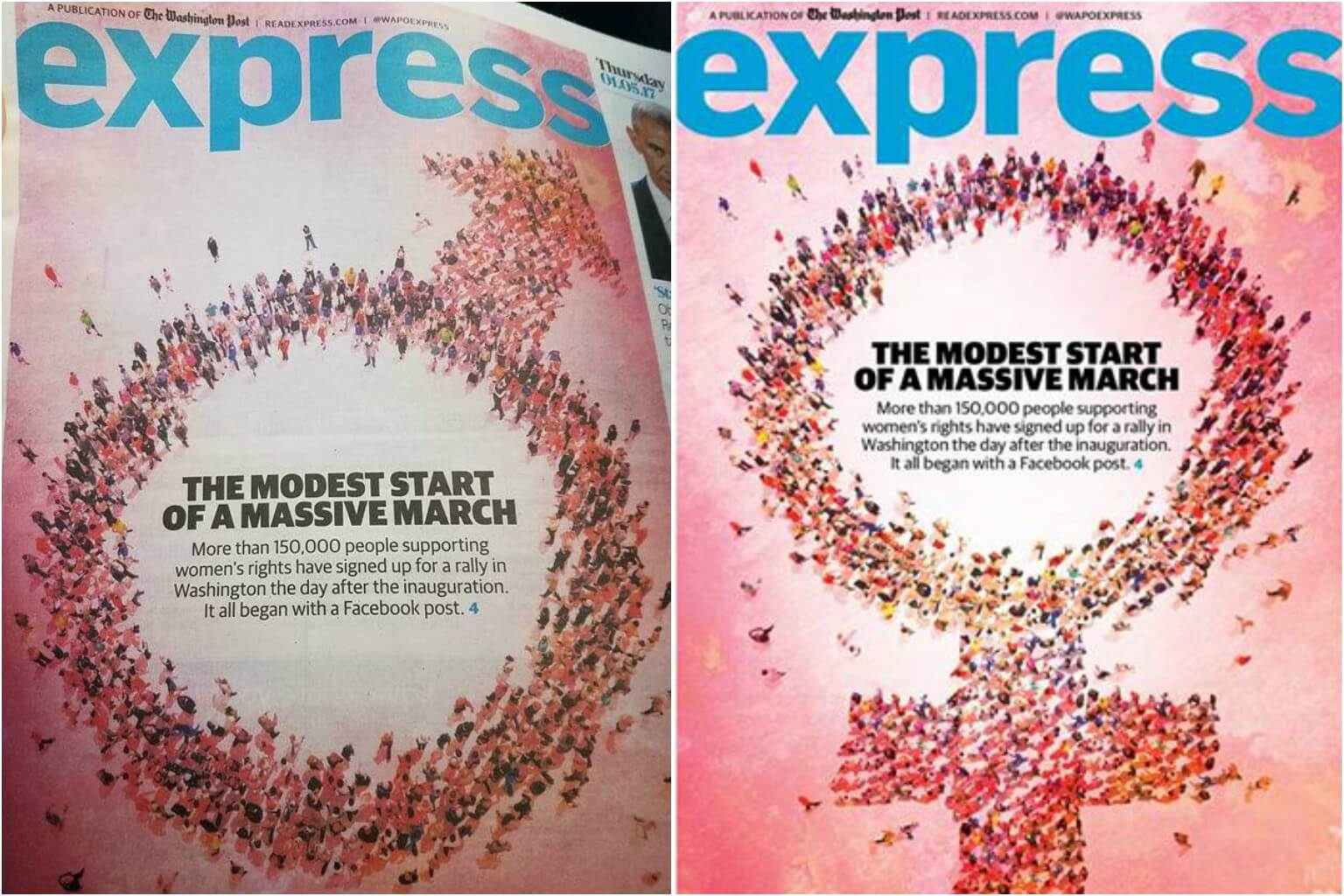 On Thursday's edition of the Washington Post Express, instead of the female symbol (right), the many individuals in the cover artwork formed the male symbol instead (left).