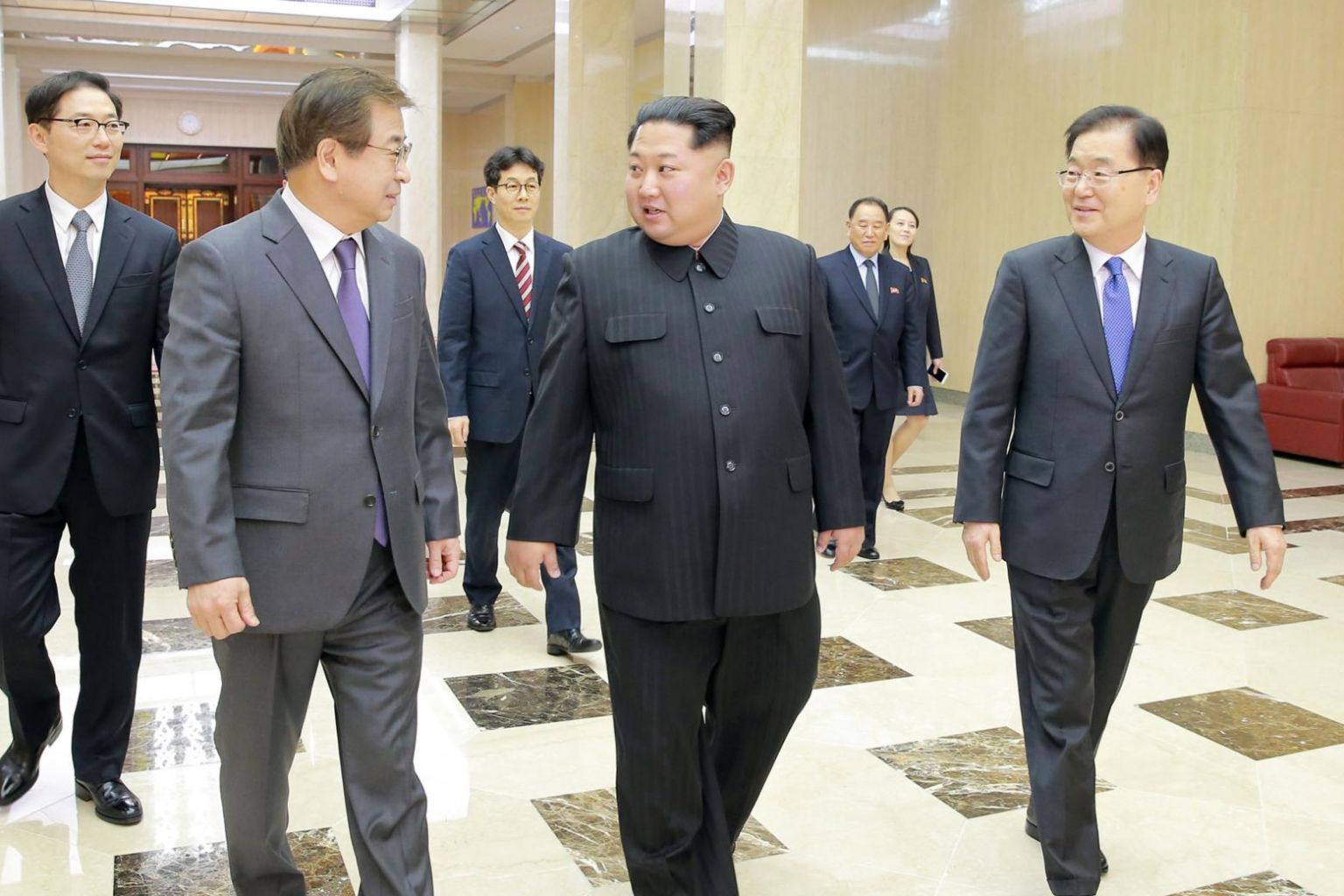 North Korean leader Kim Jong Un (centre) meeting South Korean envoys in Pyongyang on March 5, 2018.