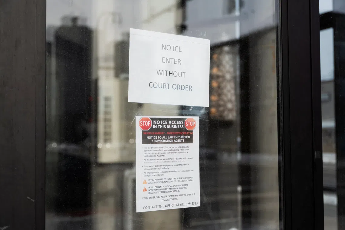 Signs prohibiting ICE agents from entering without a warrant hang on the doors of Karmel Mall, an East African shopping centre, in Minneapolis, Minnesota.