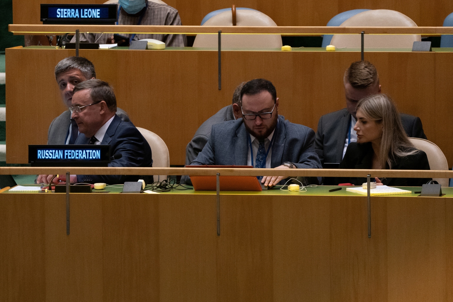 Delegates from Russia attend the Nuclear Non-Proliferation Treaty review conference in New York City, on Aug 1, 2022.